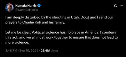Kamala Harris condemned the act and offered condolences for Kirk’s family in a post on X.