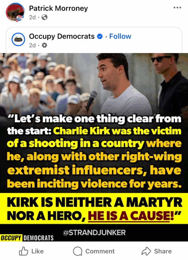 In Montgomery County, current Limerick Township supervisor, Patrick Morroney also took to social media, sharing a post by Occupy Democrats, claiming Kirk is “neither a martyr nor a hero,” but rather “a cause” of violence.