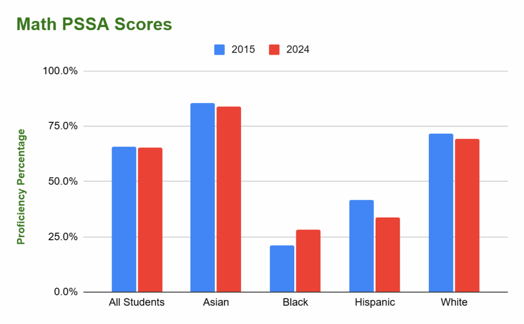 Students in grades three through eight take the Pennsylvania System of School Assessment (PSSA) every year to measure proficiency in English Language Arts and math. Since 2015, scores have dropped for all students in every category, including white and Asian students.