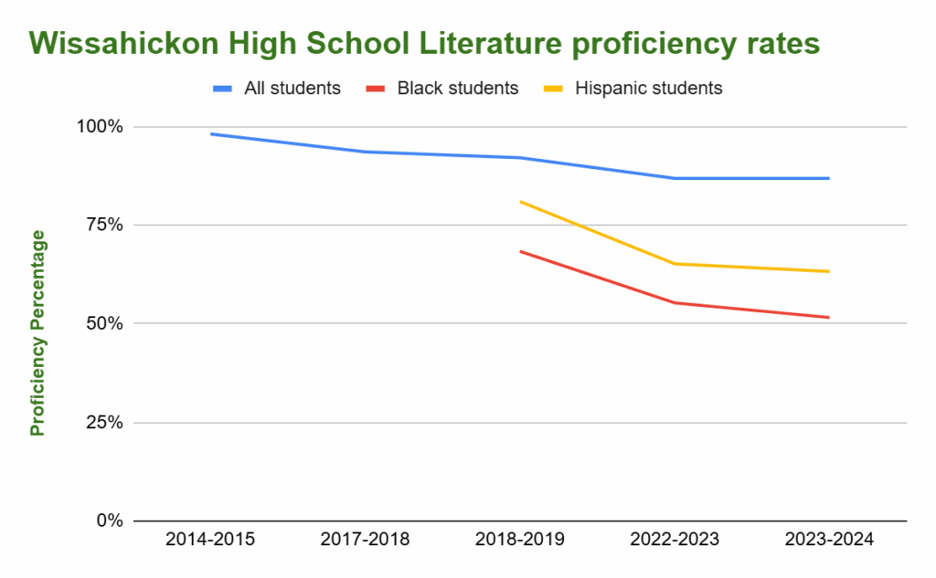 In 2015, over 98 percent of all Wissahickon High School students were proficient or advanced in Literature, yet that number dropped to 86.9 percent in 2024. Rates for black and Hispanic students dropped significantly from 2019 to 2024 with proficiency rates at only 51.6 percent for black students and 63.3 percent for Hispanic students.