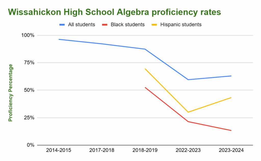 In 2015, over 96 percent of all Wissahickon High School students were proficient or advanced in Algebra, and that number plummeted to 59 percent in 2023 with a slight rebound to 63 percent in 2024. However, the results for black students are significantly lower with just over 50 percent scoring proficient in 2019, plunging to 13 percent in 2024. Hispanic student scores also dropped from 69.6 percent in 2019 to 30 percent in 2023, and then increased to 43 percent in 2024.