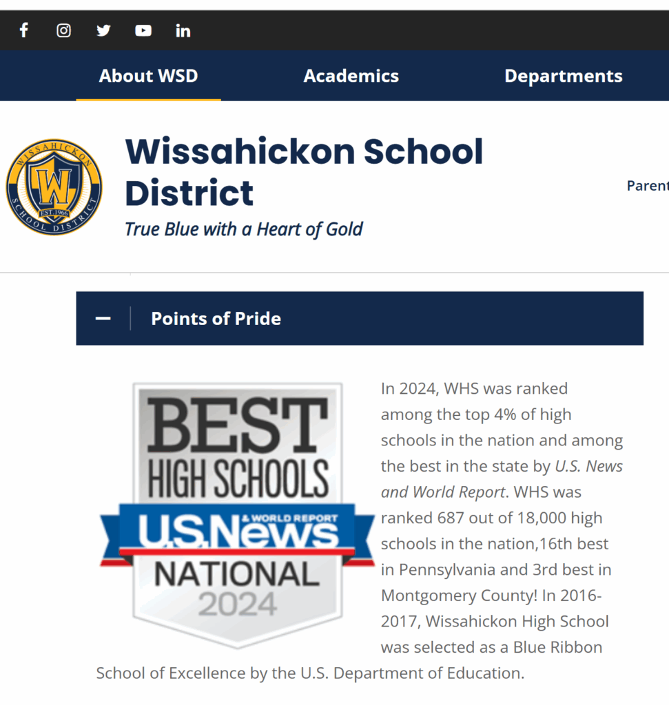 Wissahickon School District boasts of its high rankings in U.S. News and World Reports, but it fails to mention the high school rating dropped from 11th in state in 2019 to 21st in 2025. In national rankings, Wissahickon High School descended from 502 in 2019 to 701 in 2025.