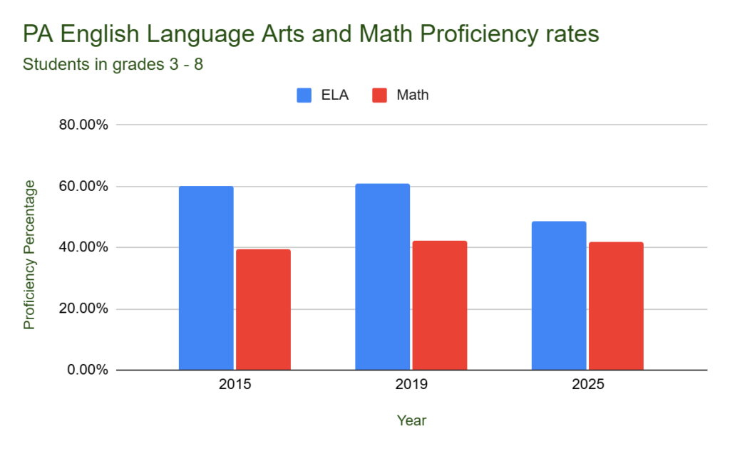 According to state standardized testing, the PSSA scores show that on average across the state students in elementary and middle school are less proficient now than they were in 2019. Over the last ten years, student proficiency in math has remained mostly flat while reading and writing proficiency decreased significantly.
