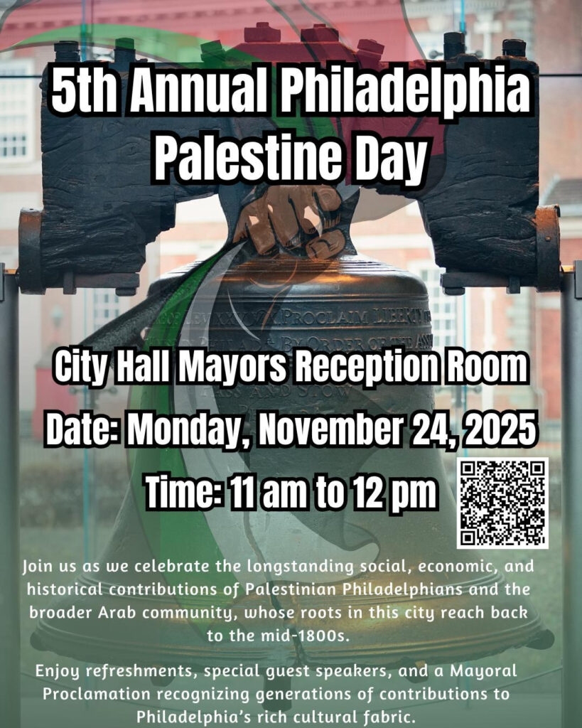 The flyer describes the event as a celebration of “the longstanding social, economic, and historical contributions of Palestinian Philadelphians and the broader Arab community, whose roots in this city reach back to the mid-1800’s.”