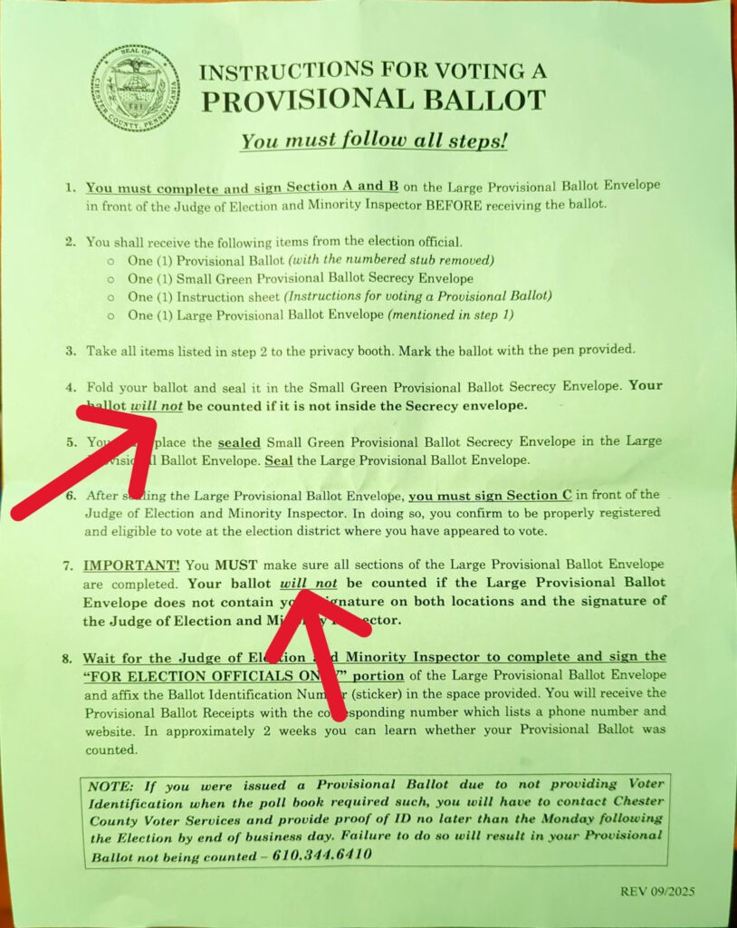 The instructions for voting with a provisional ballot clearly state that votes will not be counted if the ballot is not inside the secrecy envelope or if the voter’s signature is not in both locations.