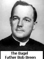 After the train pulled into New York’s Penn Station, we walked several blocks to a small Irish pub. It was late in the afternoon – too early for the game. “He said to meet him here,” said Sadie. Near the front of the establishment, in a booth by himself, was a man in his early 30s (which, at the time, we considered to be middle age), wearing an old-time baseball jacket, the kind that had a woolen body and leather sleeves. He was holding a black cigar. It was Reverend Robert H. Breen, a recently ordained priest with the curious nickname “Bagel.”