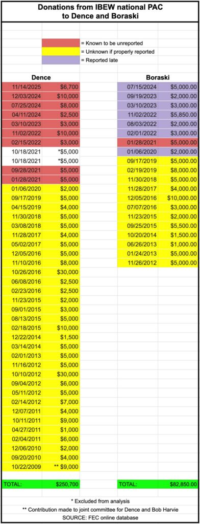 Despite those omissions becoming public knowledge in 2024, the federal IBEW PAC gave Dence $10,000 more in December of that year and another $6,700 in November 2025. Just as he hasn’t reported this money as it comes in, he hasn’t described how he spends it, leaving the public in the dark about how he has benefited from it.